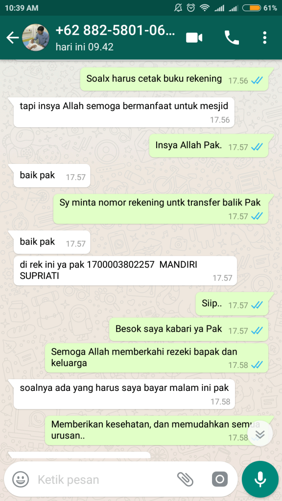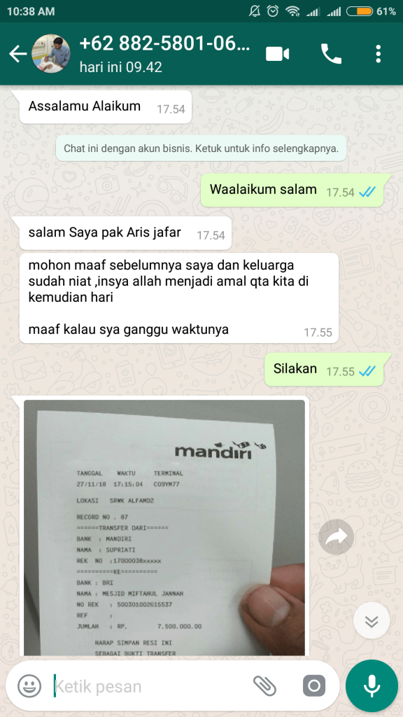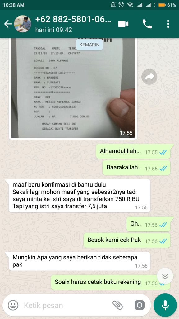 Beliau mengucapkan salam, lantas mengirimkan slip transfer senilai Rp. 7.500.000 ke rekening masjid. Slip ini menunjukkan pengirim dana menggunakan rekening dan ATM Mandiri, transfer ke rekening BRI Masjid kami, Mesjid Miftahul Jannah.