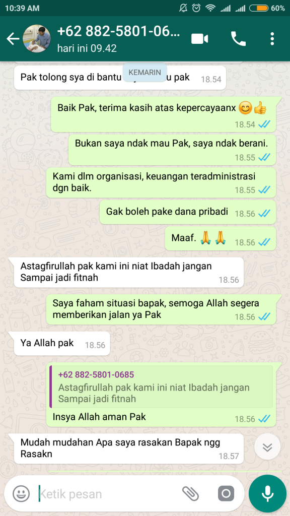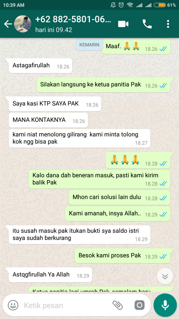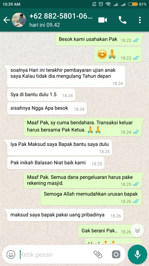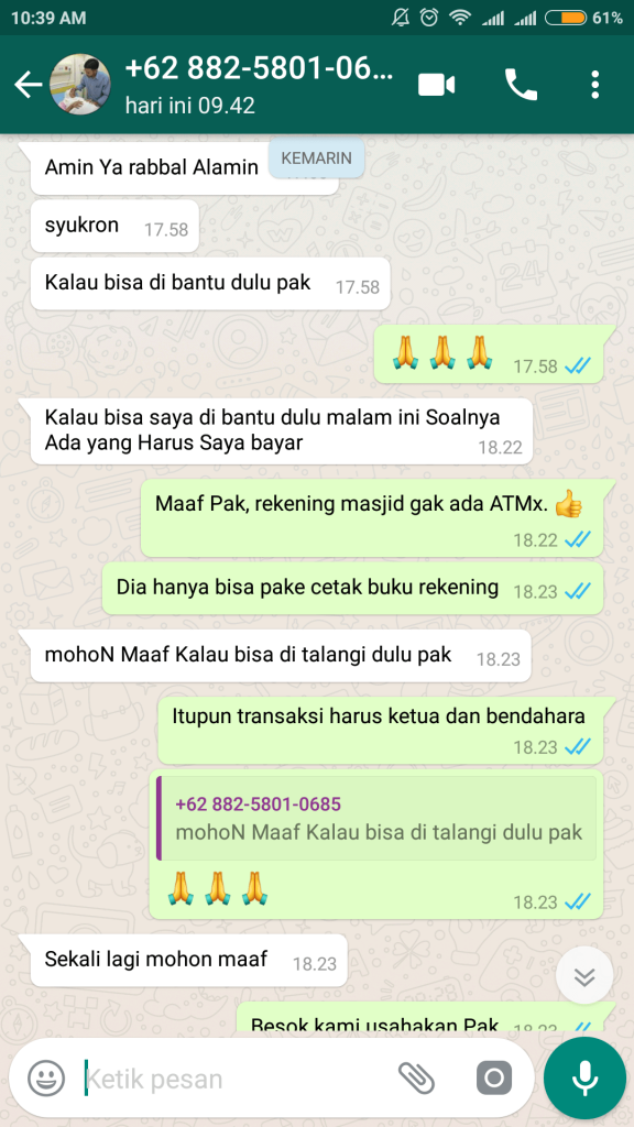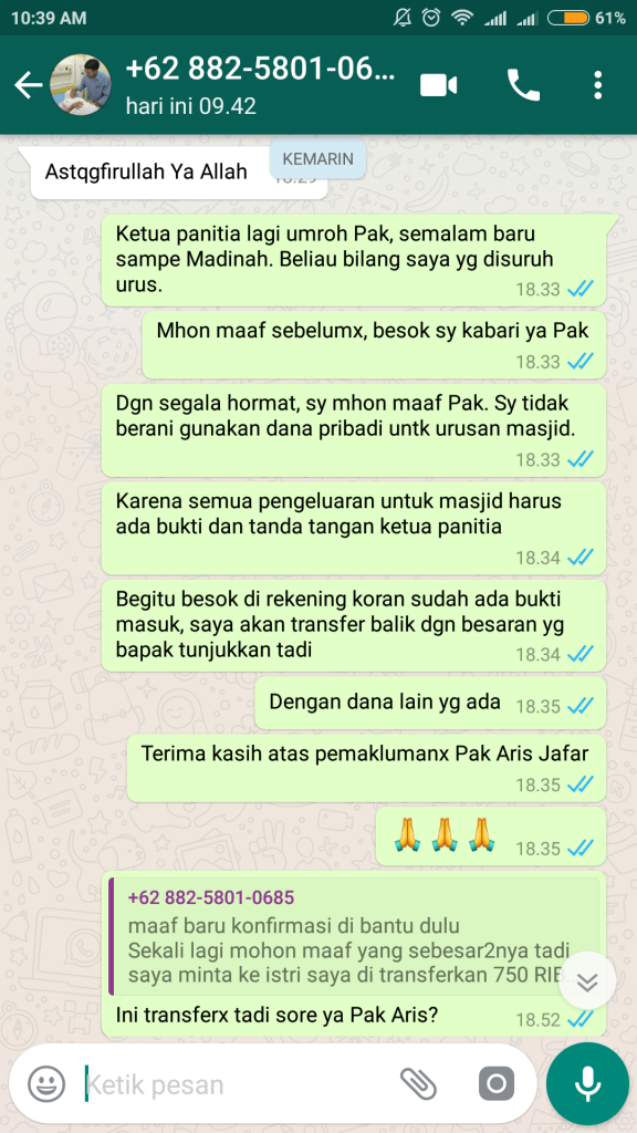 Saya sebelumnya memang mencantumkan nama dan nomor HP saya sebagai nomor untuk konfirmasi bagi para donatur yang ingin berinfaq demi kelanjutan pembangunan masjid di desa kami.