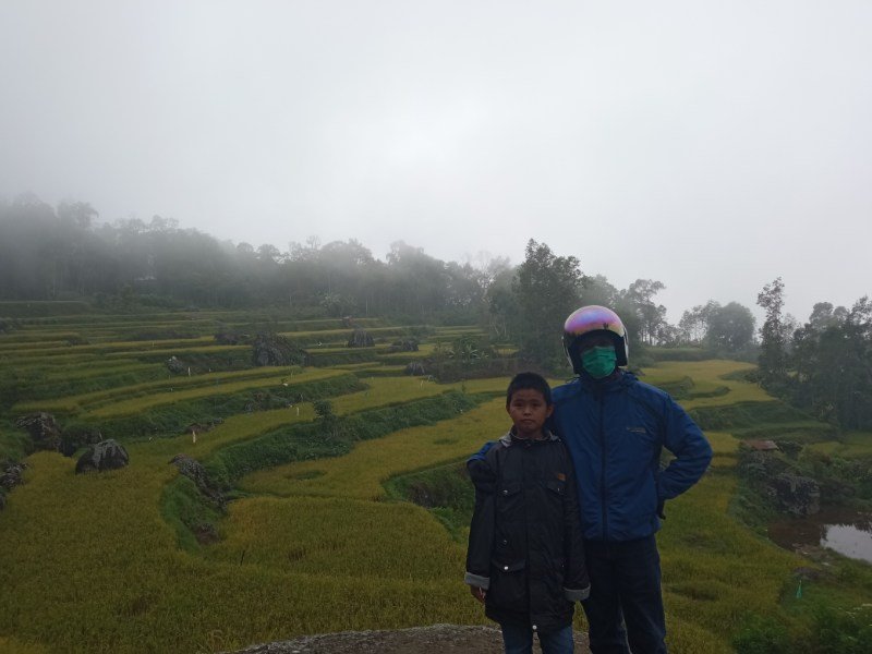 Di kiri kanan perjalanan terdapat sawah terasering. Dari beberapa titik kami bisa melihat puncak gunung Sesean, menabrak kabut, menyaksikan indahnya pemandangan pegunungan, melihat bapak-bapak nongkrong dengan sarung tetap menyelimuti tubuhnya, melihat anak-anak berseragam SD berjalan kaki yang ketika ditanya mengatakan bahwa mereka sedang menuju sekolah SMP untuk mendaftar. Fuih, jadi kangen pengen ngulang lagi kan .. :(